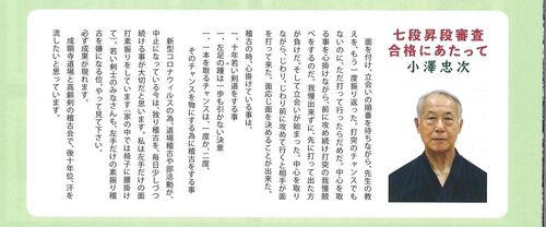 昨年8月に七段に合格された小澤忠次先輩(S43年・1968年卒)が昇段に向けた稽古に関して、寄稿された文章が流山市剣道連盟の広報誌に掲載されました。小澤先輩にご承諾をただきましたので、皆さんにご紹介させていただきますのでご覧下さい。 小澤先輩、た…